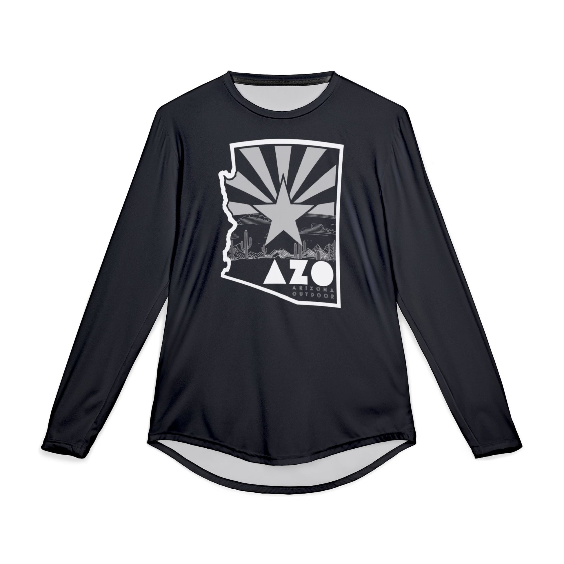 A stylish and functional long sleeve shirt for hikers and trail runners, featuring a bold Arizona state logo. This shirt provides excellent UV protection up to 50 SPF, making it perfect for outdoor activities. The durable hemmed edges and shoulder tape ensure long-lasting quality. Ideal for outdoor enthusiasts looking to stay protected from the sun while exploring the trails, or playing pickelball at 56th Street next to Arizona Falls.