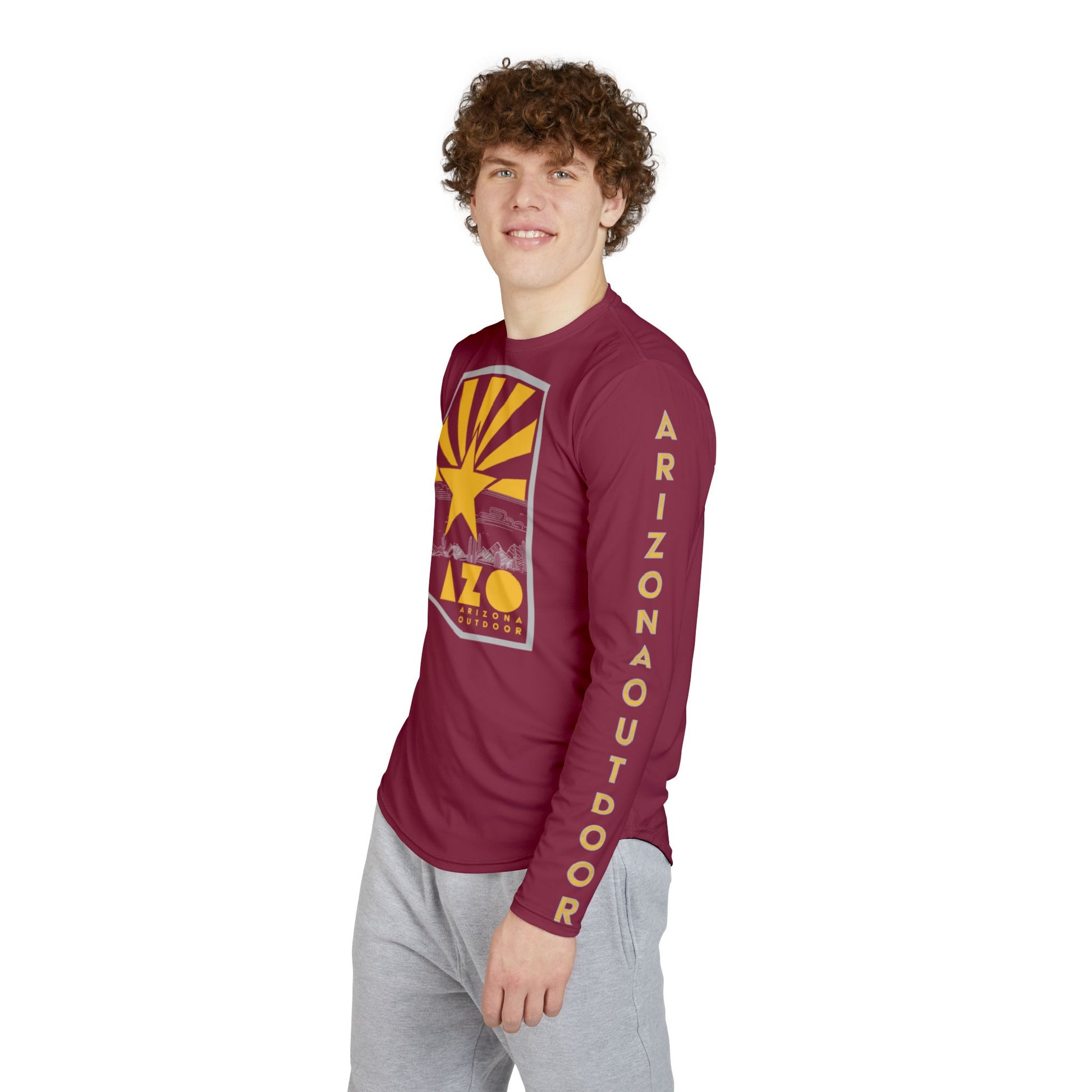 Show school pride AZ-themed sun protection long sleeve shirt perfect for trail running, field sports, and any indoor or outdoor fitness activity. The shirt provides UV protection up to 50 SPF, making it ideal for outdoor use. It is made of 88% polyester and 12% spandex, offering durability, stretch, and softness for any active lifestyle. The hemmed edges and shoulder tape add to the garment's longevity and stability, making it a reliable choice for those on the go.